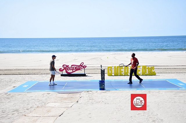 Acapulco, Gro., (20/feb/2026). Alex de Miñaur y Gael Monfils jugaron al mini tenis a la orilla del mar en la playa de Revolcadero, frente al hotel Pierre Marqués, en el contexto del inicio del Abierto Mexicano de Tenis, que se disputará en la Arena GNP del 21 al 28 de febrero próximo.